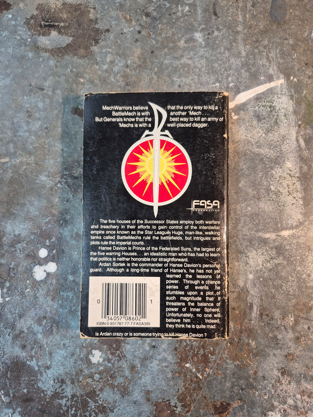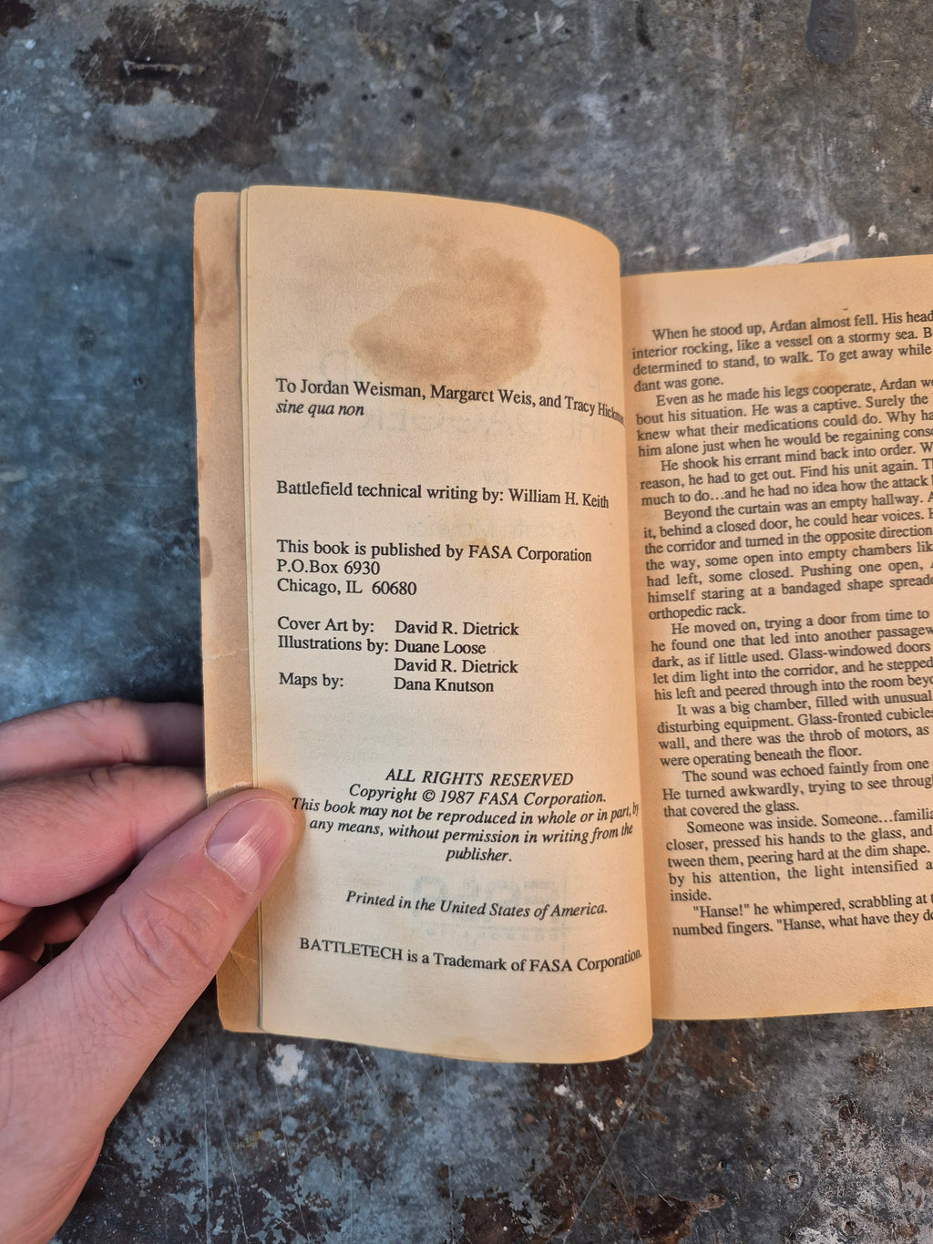 Late 80s Battletech novel by Ardath Mayhar, in rough-but-solid condition with wear and heavy tanning around the front and back covers, but the page block is clean and only mildly tanned. Very sought-after.
