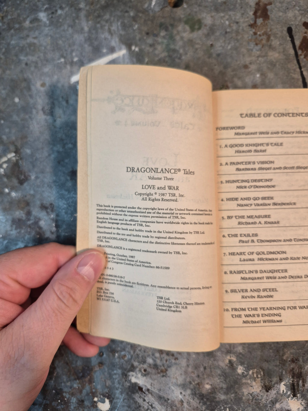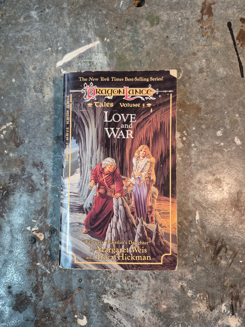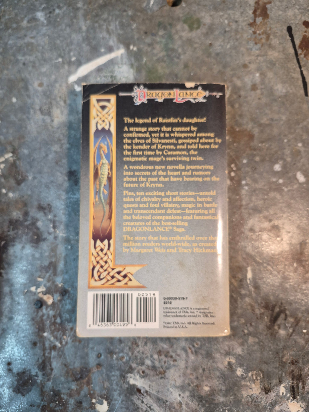 Late 80s DragonLance novel by Margaret Weis and Tracy Hickman, in good condition with minor wear and tanning.