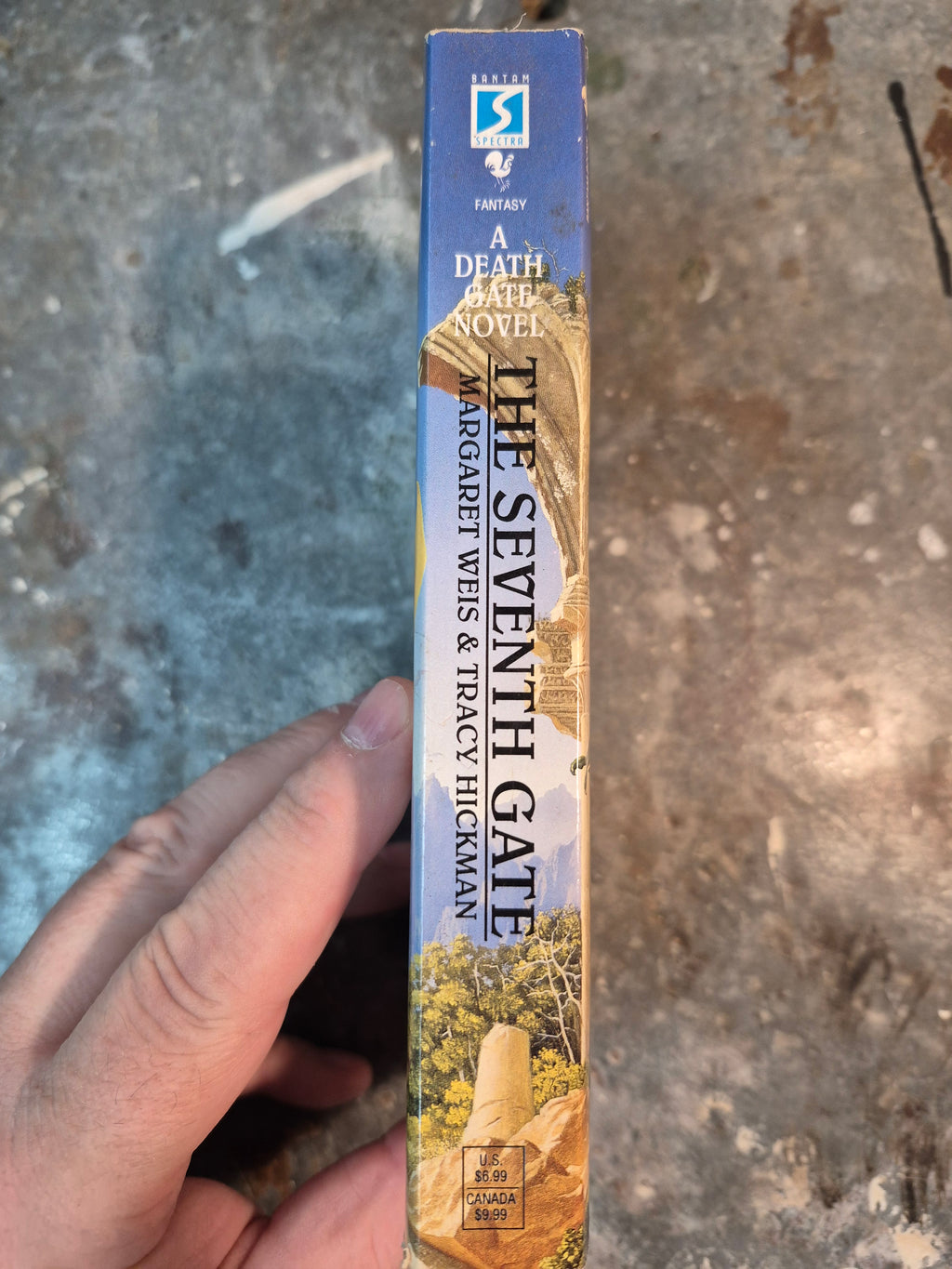Mid 90s Death Gate novel by Margaret Weis and Tracy Hickman, in good condition with minor wear and tanning.