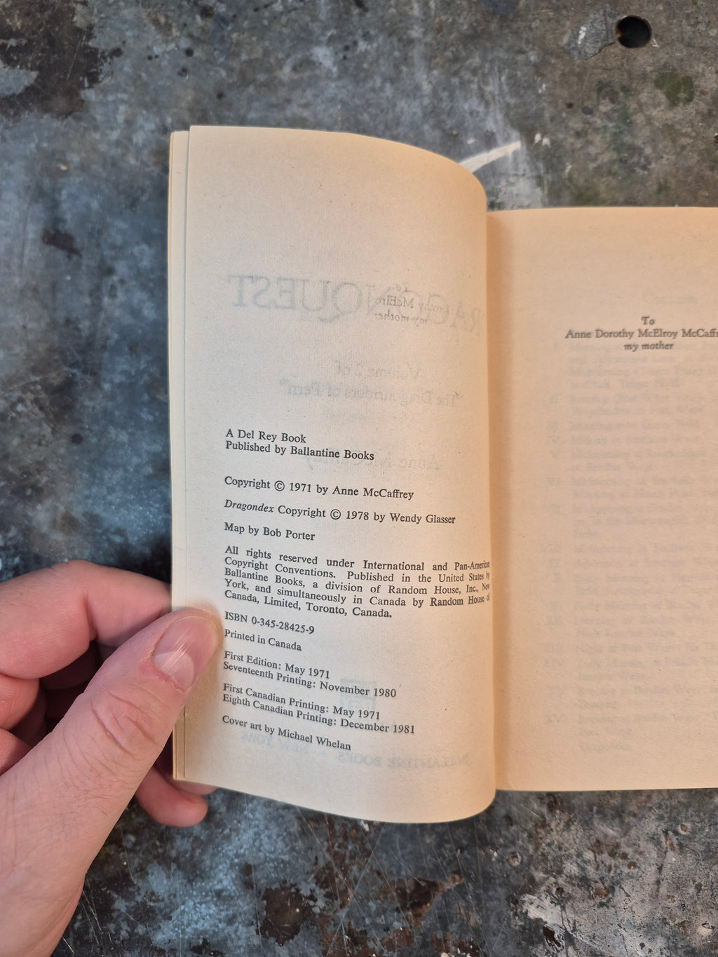 Early 80s edition of the classic by Anne McCaffrey, in great condition with minor wear and tanning.