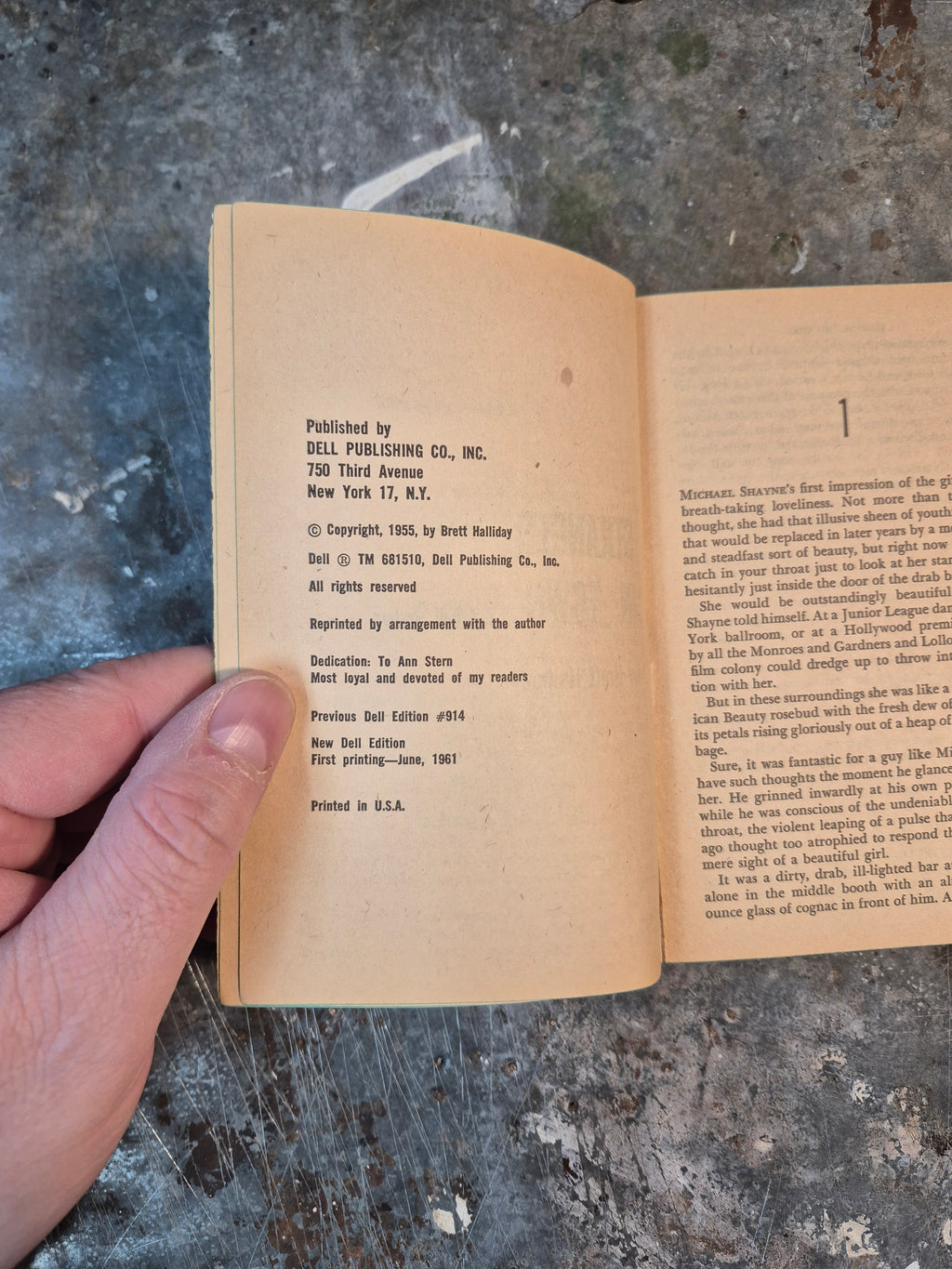 Early 60s Mike Shayne novel by Brett Halliday, in rough-but-readable condition with minor wear and tanning.