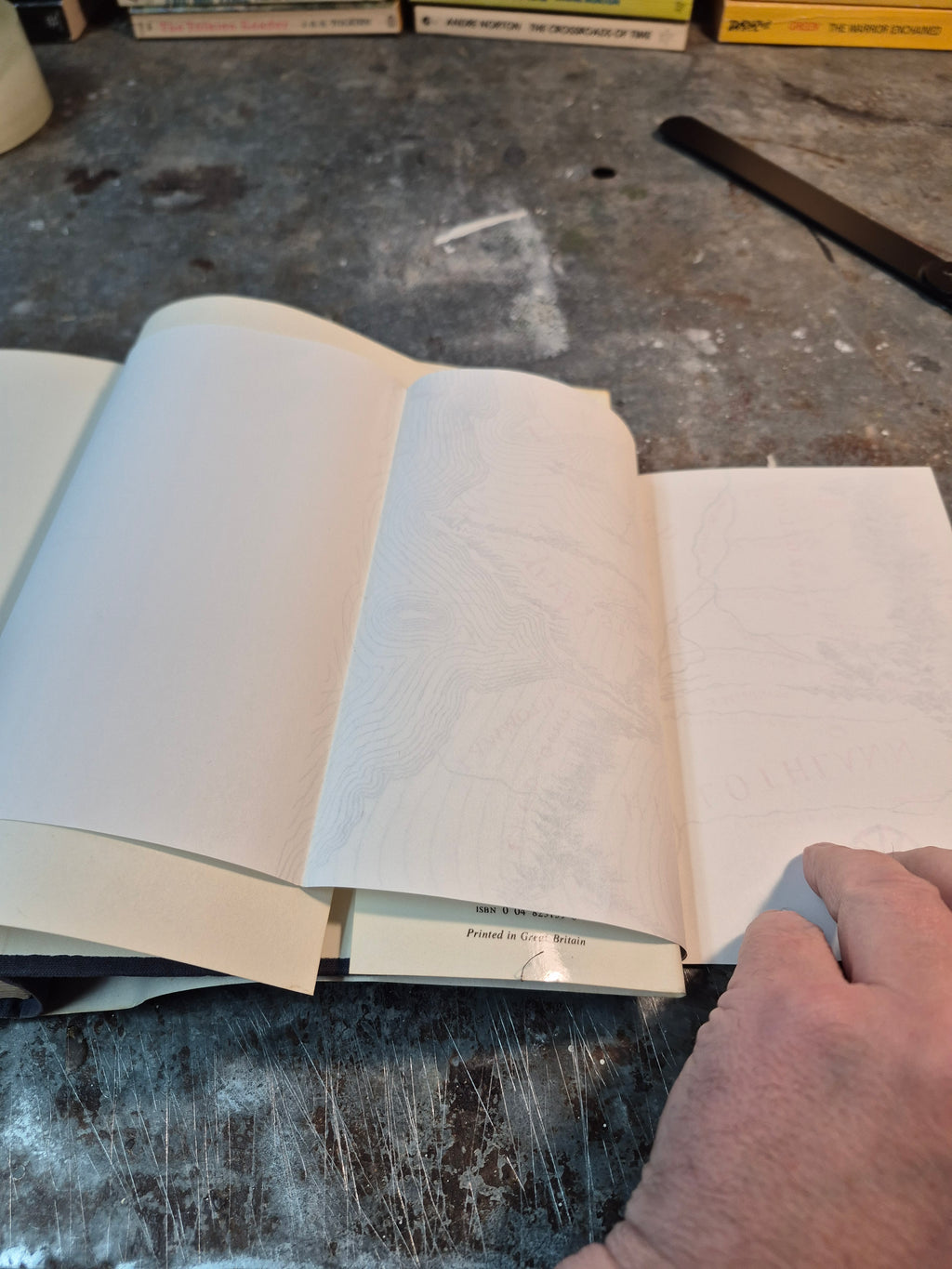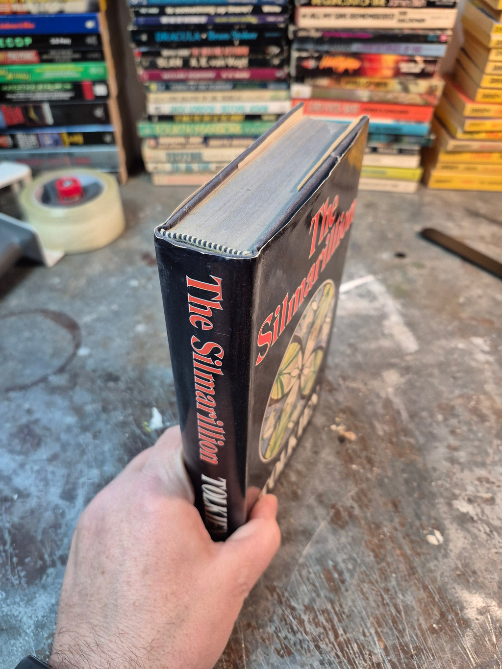 Late 70s hardcover edition of The Silmarillion by J. R. R. Tolkien, in good condition with minor wear and scuffing. Slight lean to spine.