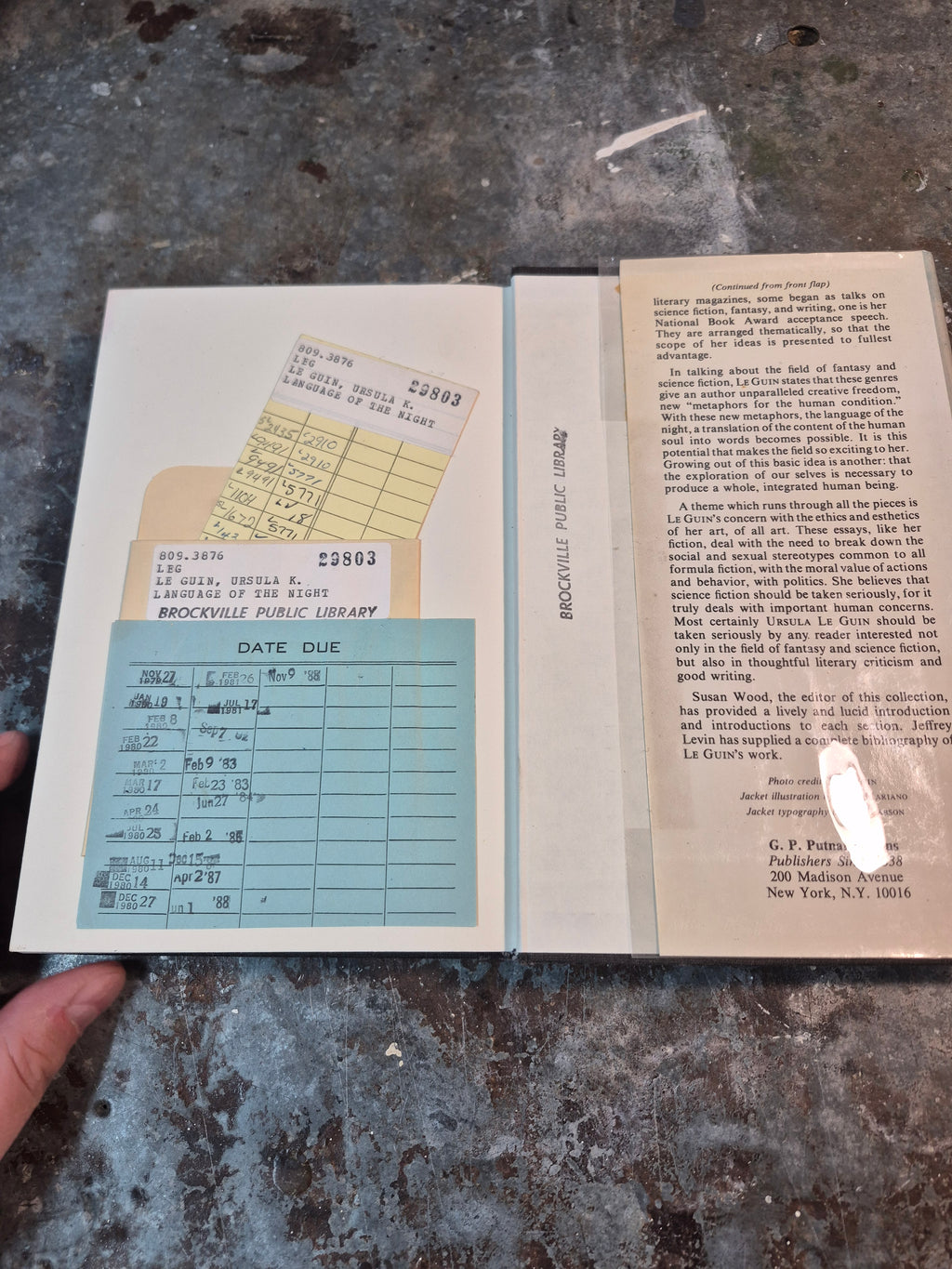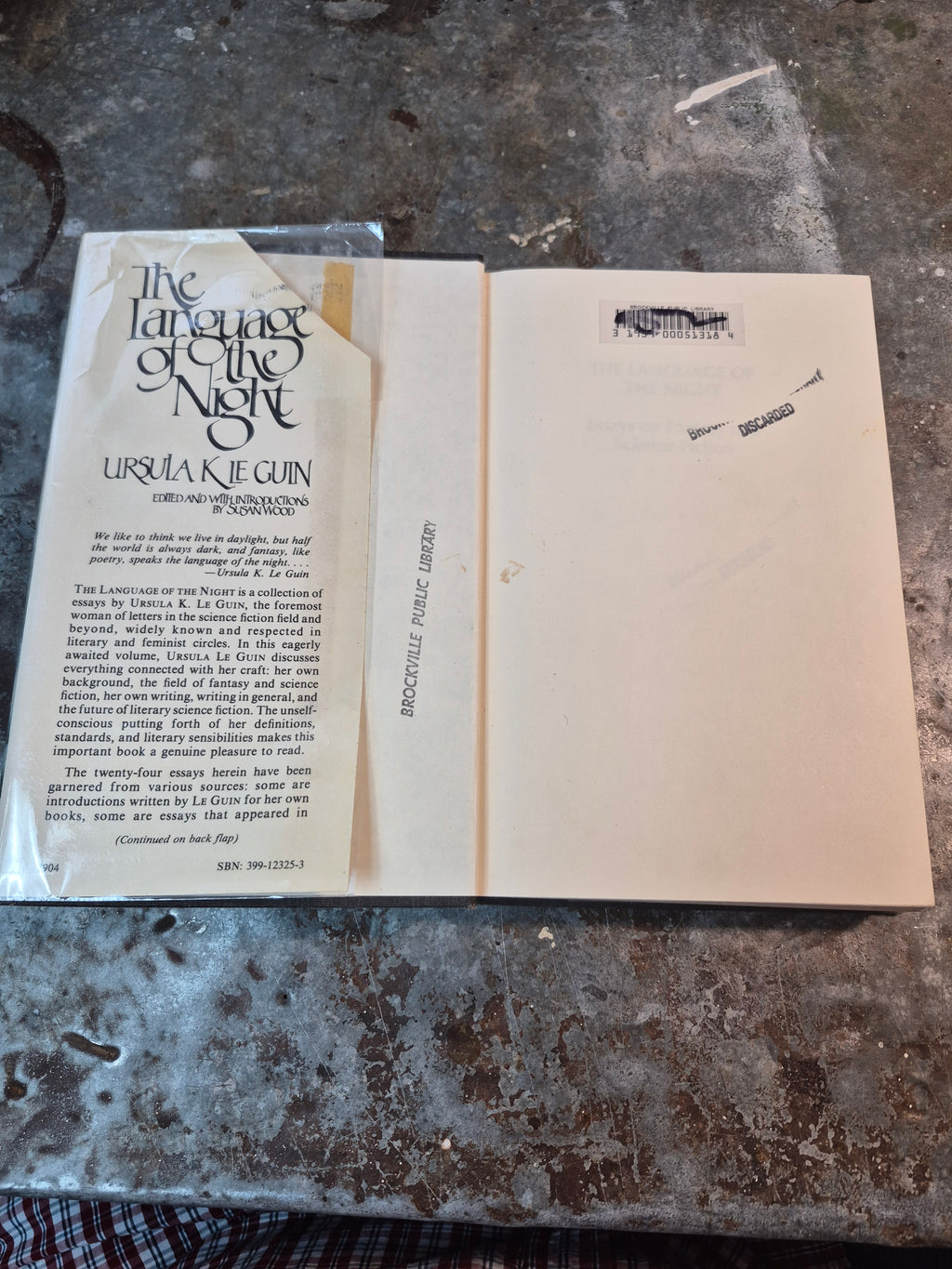 Late 70s hardcover ex-library edition of the collection of essays edited by Ursula K. Le Guin, in good condition with minor wear and tanning. Typical ex-library issues, price clipped.