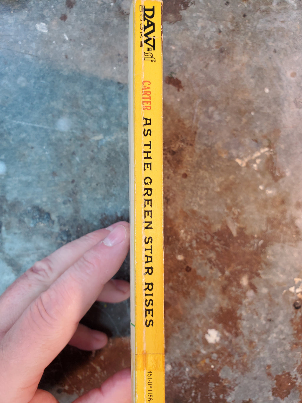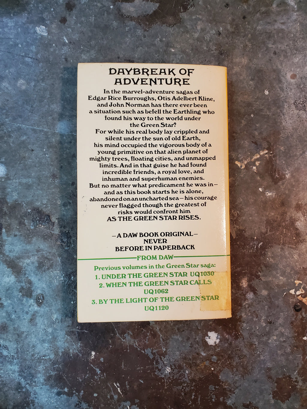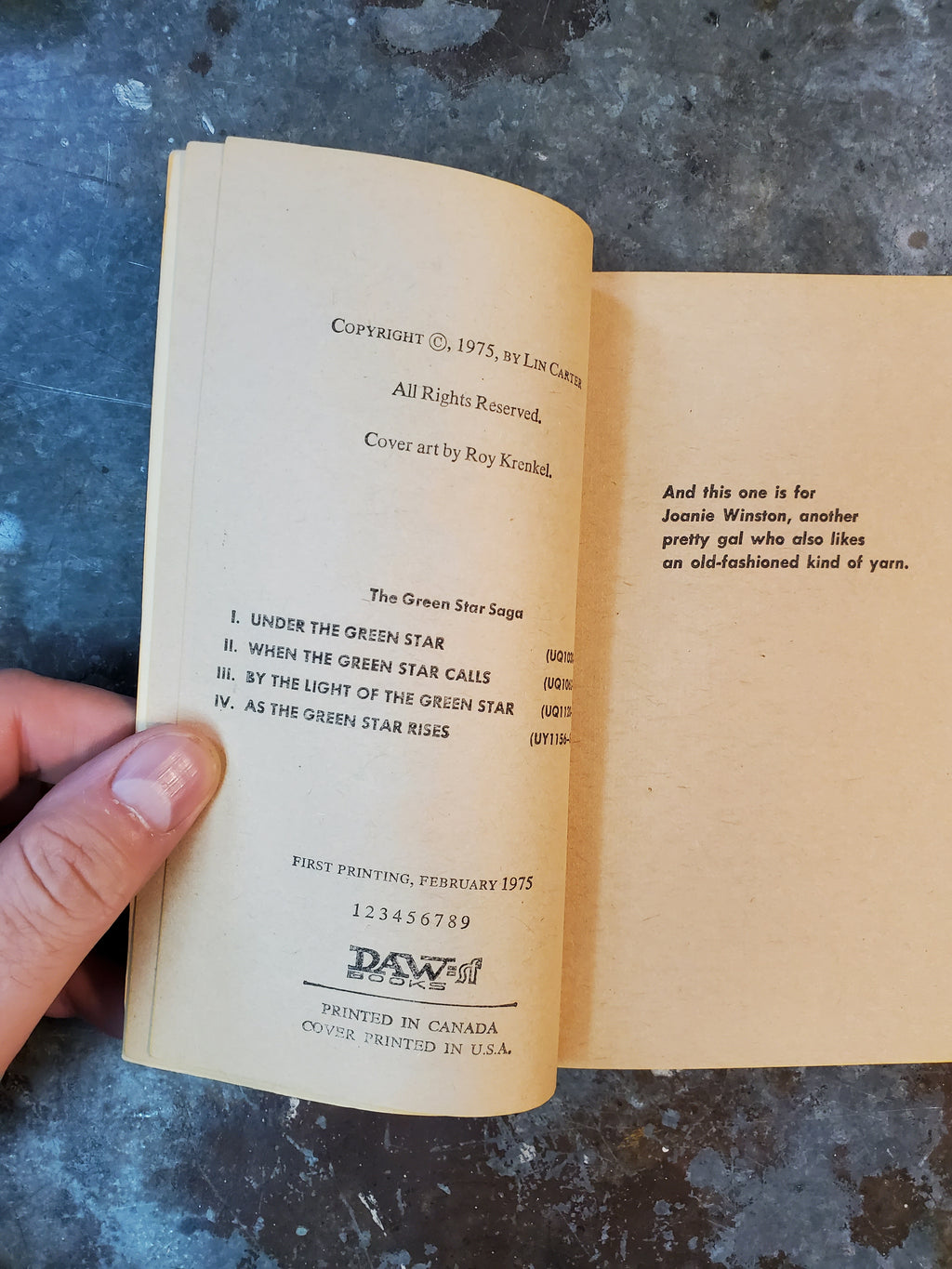 Mid 70s novel by Lin Carter, in decent condition. Minor wear and tanning. Bookstore stamp and name written in the front.