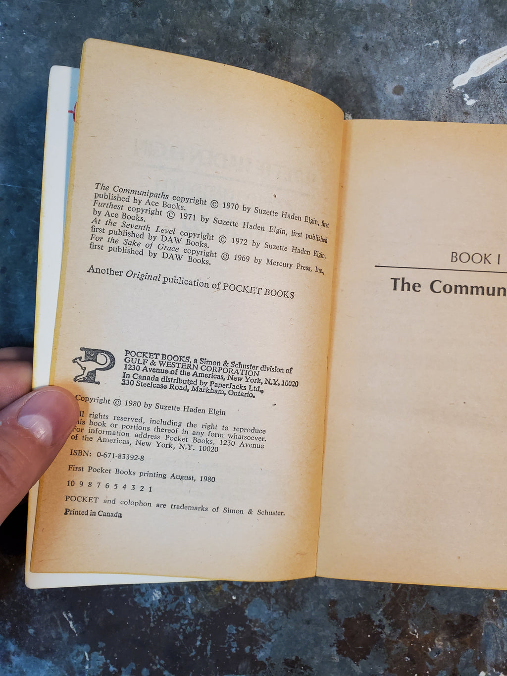Early 80s novel by Suzette Haden Elgin, in decent condition with medium level wear and tanning. Spine creases and a spectacular previous owner bookplate in the front. Solid and readable overall.