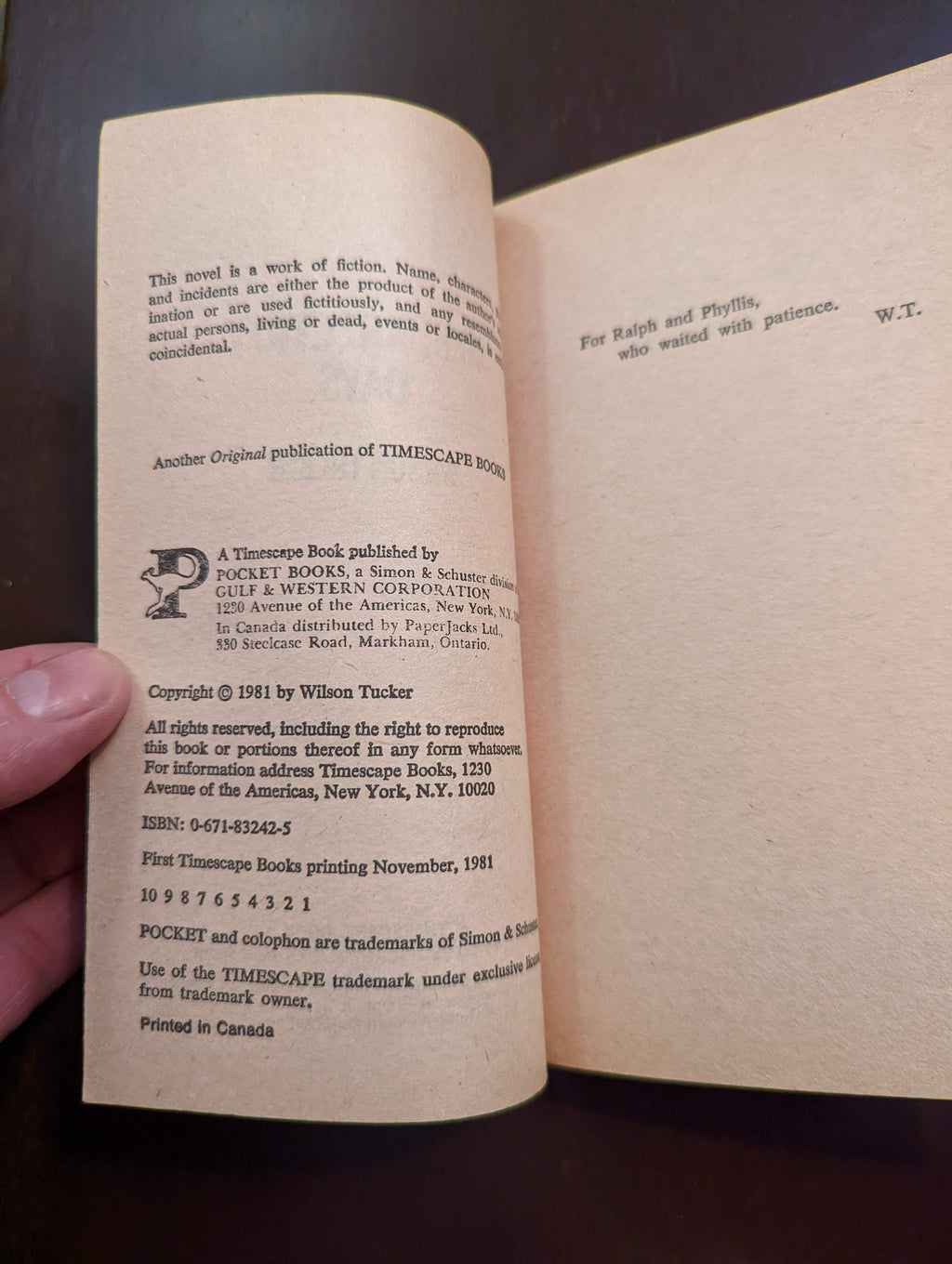 Early 80s Pocket Books Timescape edition of the Wilson Tucker novel. This copy is in good condition with only minor wear.