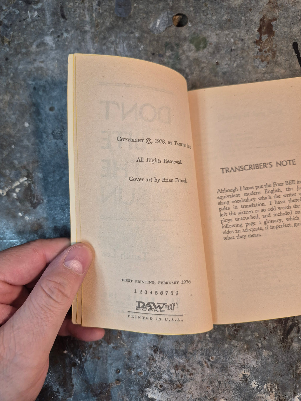Mid 70s novel by Tanith Lee, in good condition with minor wear and tanning. Page block very clean and bright. Remainder mark on top edge. Rare book in great condition overall.