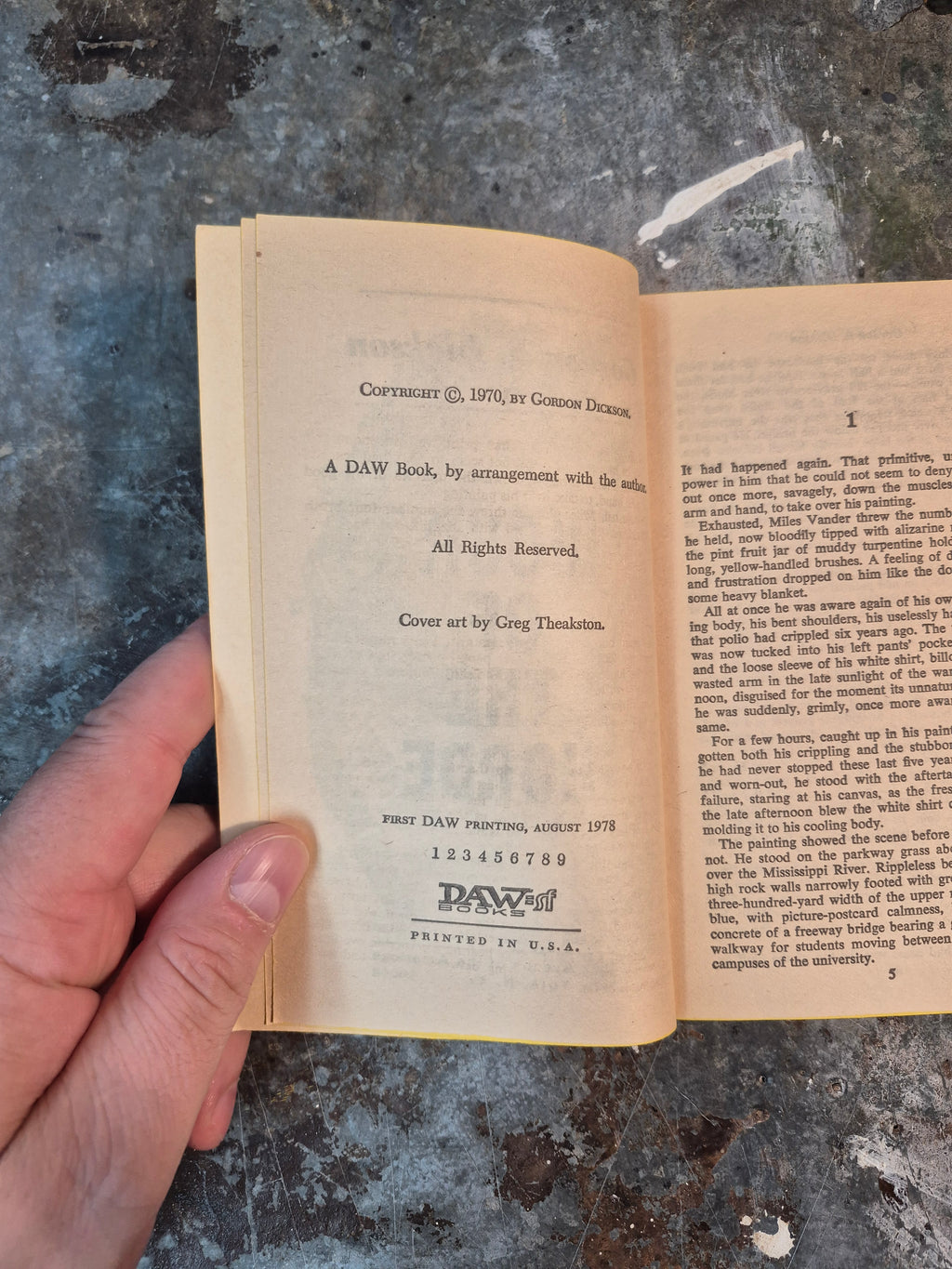Late 70s Daw edition of the novel by Gordon R. Dickson, in good condition with minor wear and tanning.