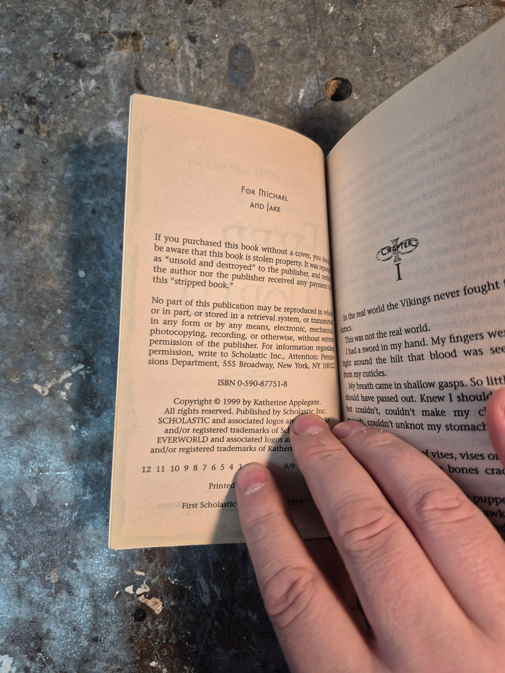 Late 90s edition of the Everworld novel by K. A. Applegate, in good condition with minor wear and tanning.