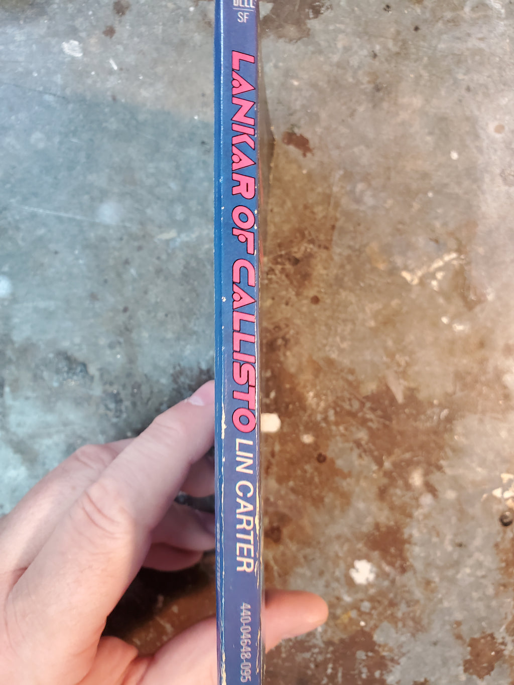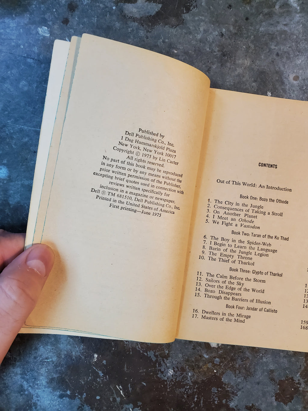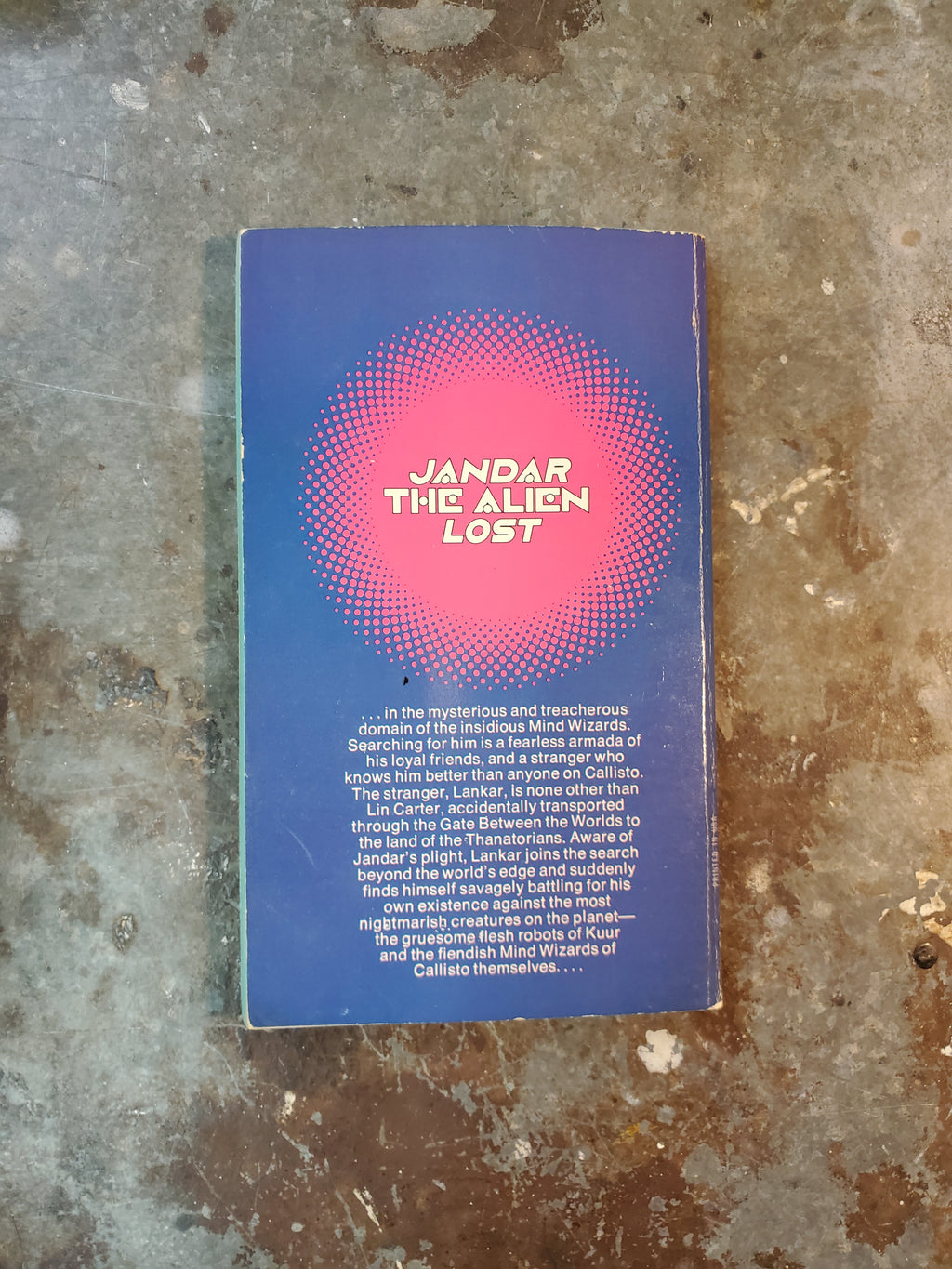 Mid 70s novel by Lin Carter, in decent condition. Minor wear and tanning. Bookstore stamp and name written in the front.