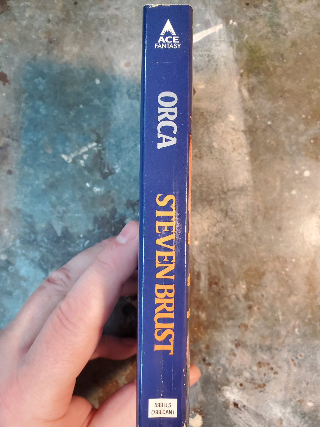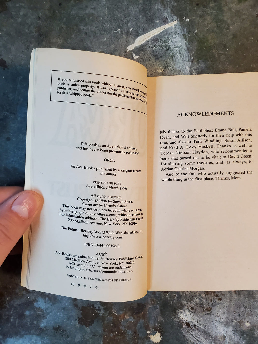 Mid 90s Vlad Taltos novel by Steven Brust, in great condition with mild wear and tanning. Bookstore stamp and name written in the front.