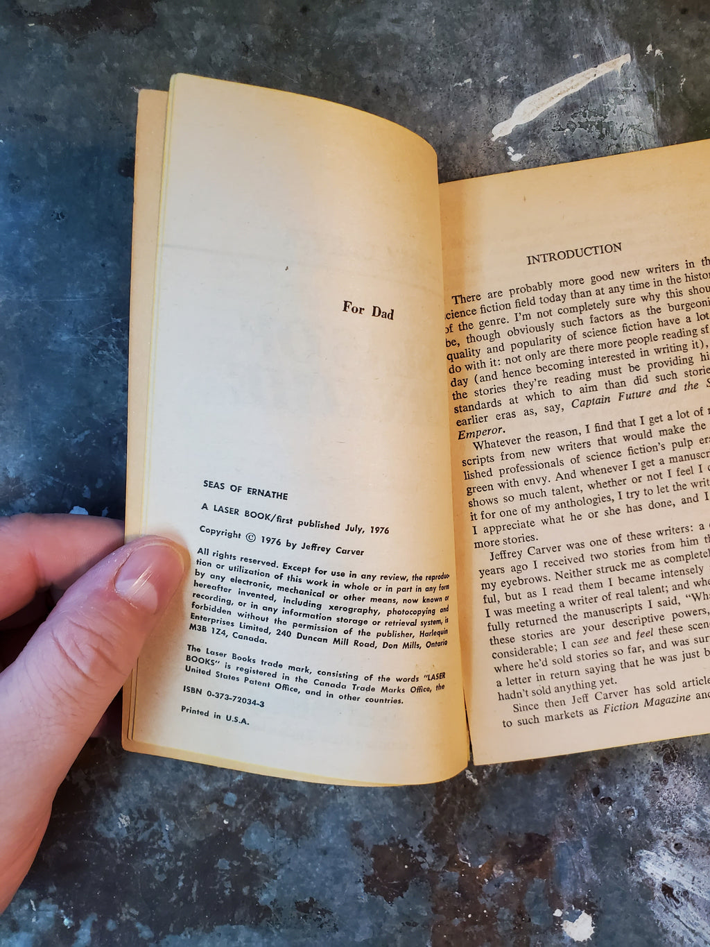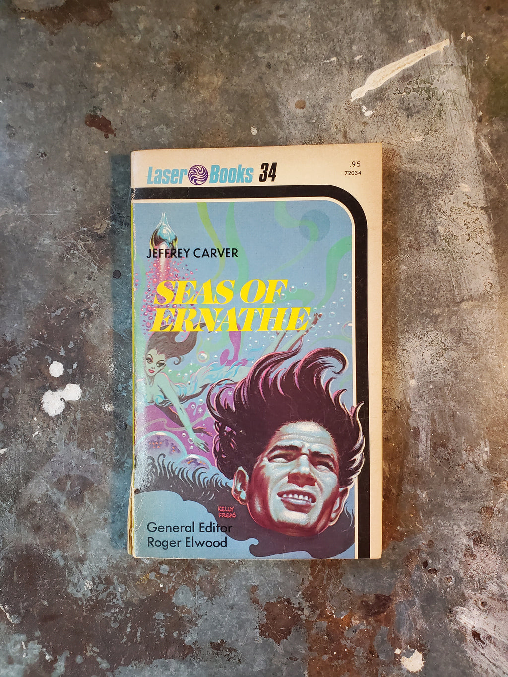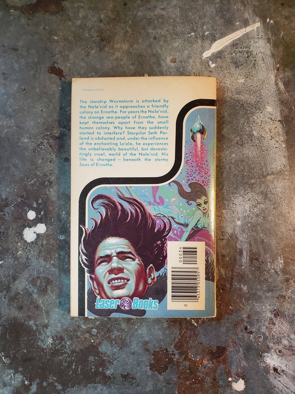 Mid 70s Laser Book by Jeffrey Carver, in decent condition with minor wear and tanning. Notable scuff/tear to bottom of spine, very clean otherwise.