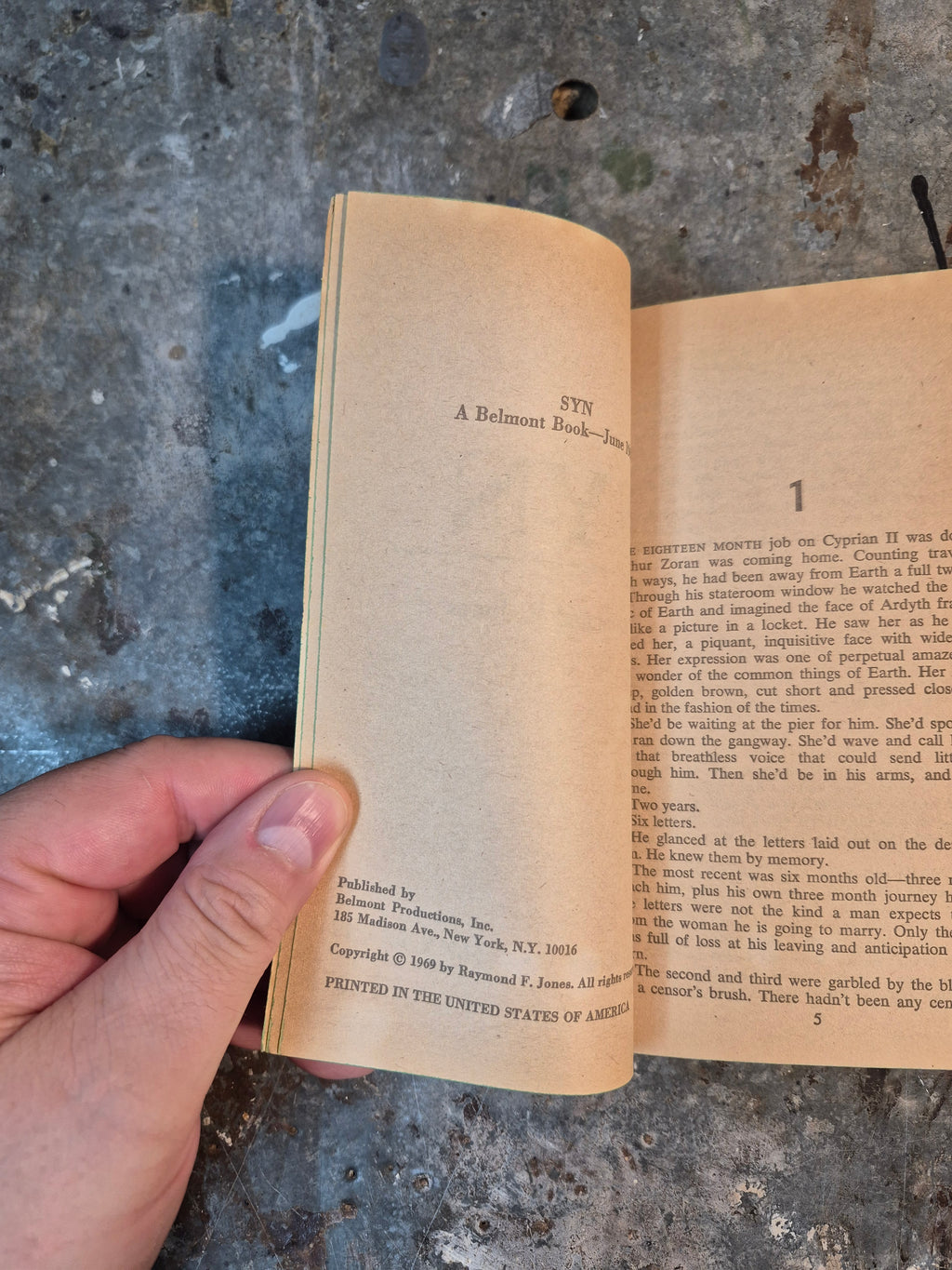 Late 60s novel by Raymond F. Jones, in good condition with minor wear and tanning.