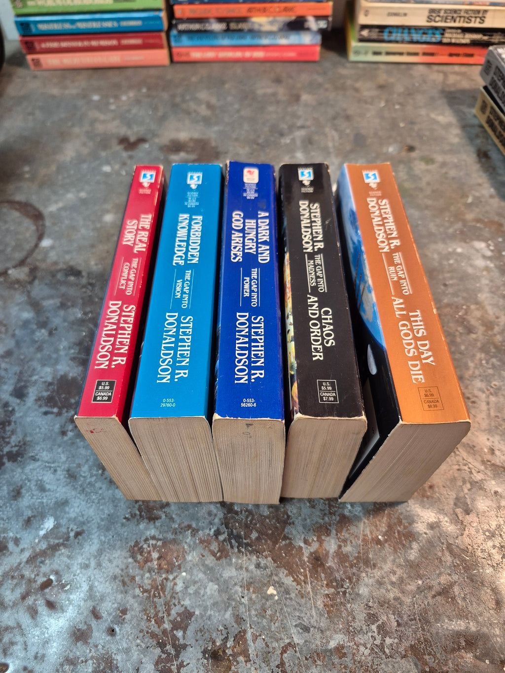 Early 90s pentalogy by Stephen R. Donaldson, in good condition with minor wear and tanning.