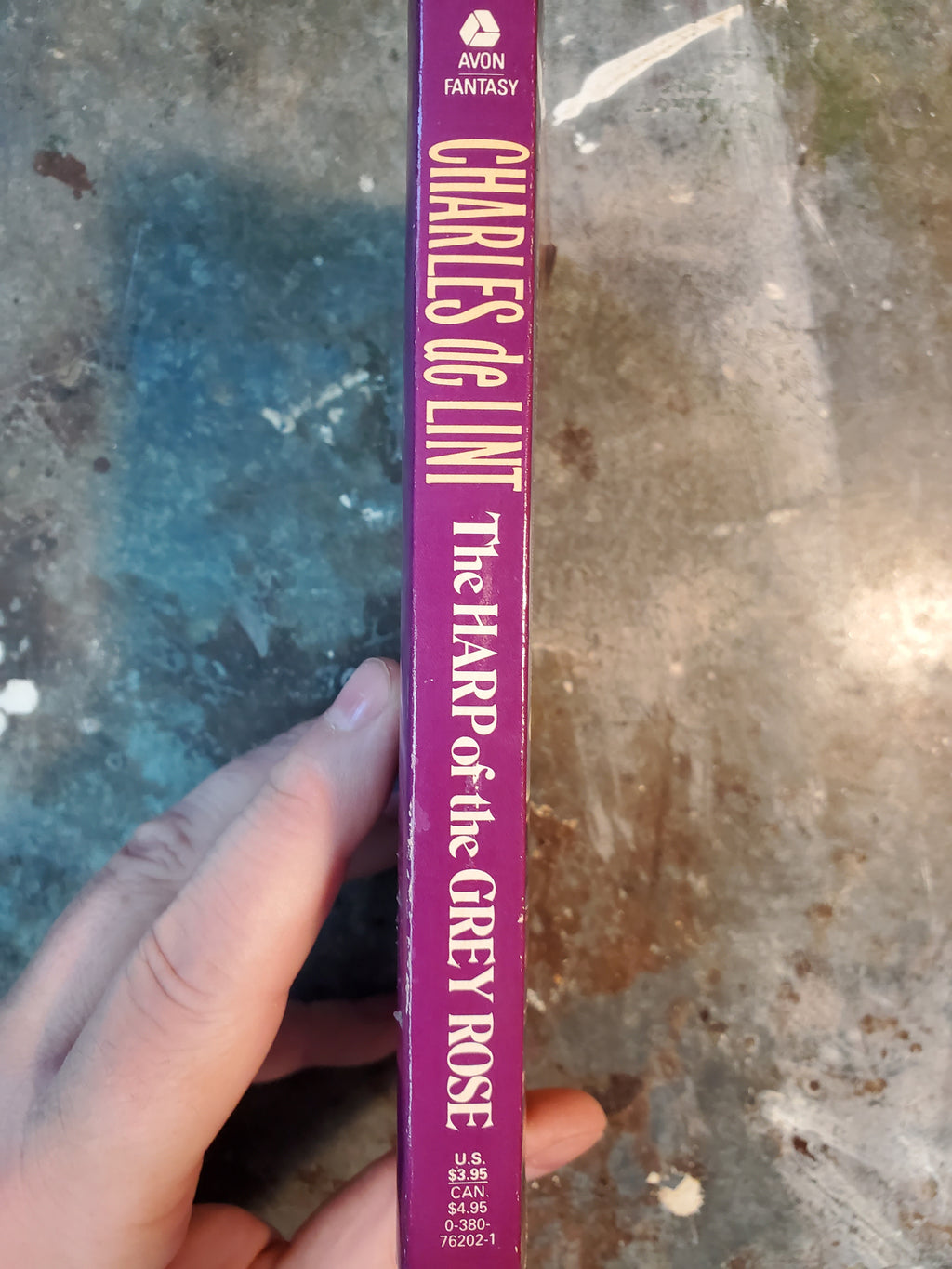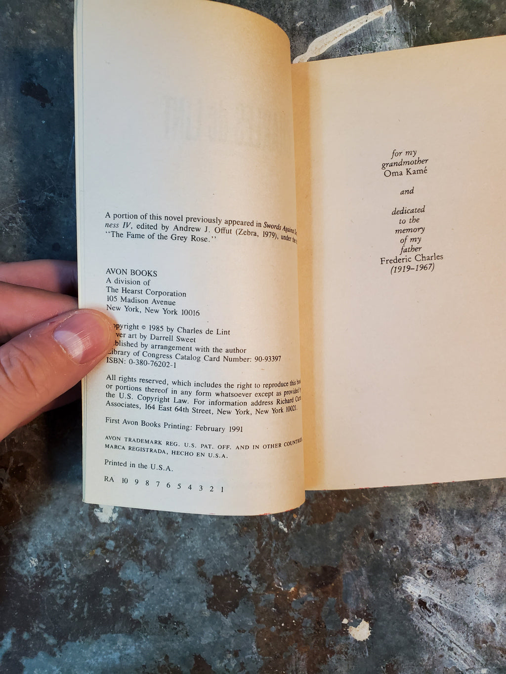 Early 90s Fantasy novel by Charles de Lint, in good condition with mild wear and tanning. Bookstore stamp on the bottom edge, and written name in the front.