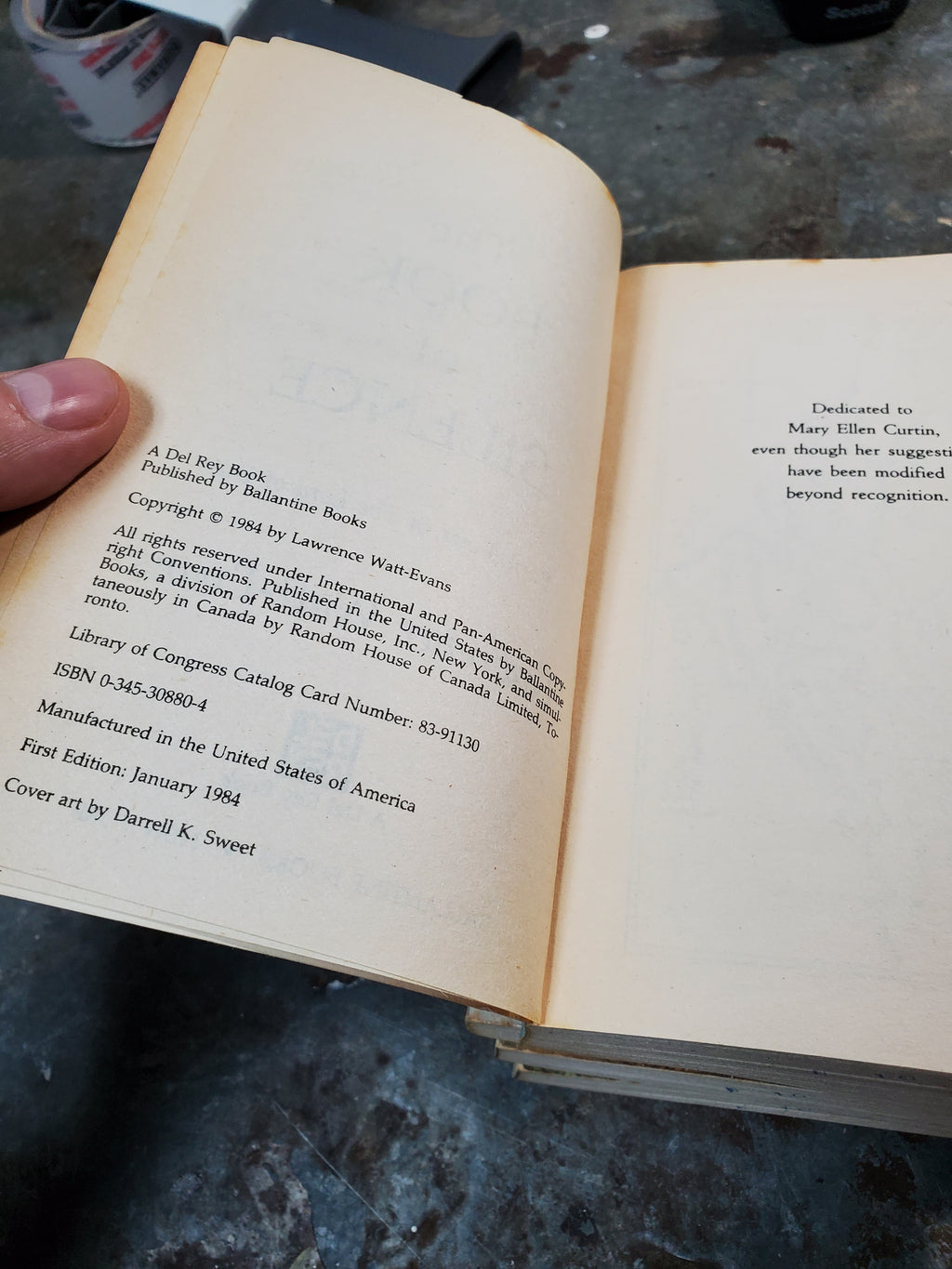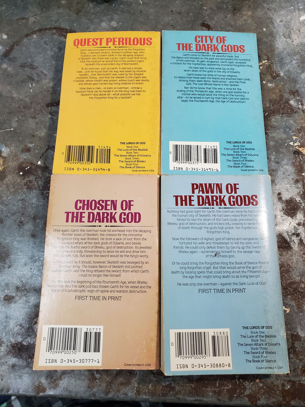 Nice 80s copies of the quartet by Lawrence Watt-Evans, in decent mildly worn condition. All 4 are square and solid. Notable amounts of spotting/foxing on the top edges.