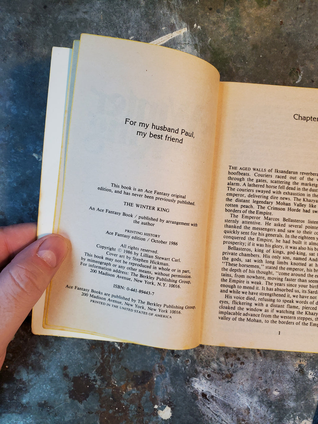 Mid 80s novel by Lillian Stewart Carl, in great condition with mild wear and tanning. Bookstore stamp and name written in the front.
