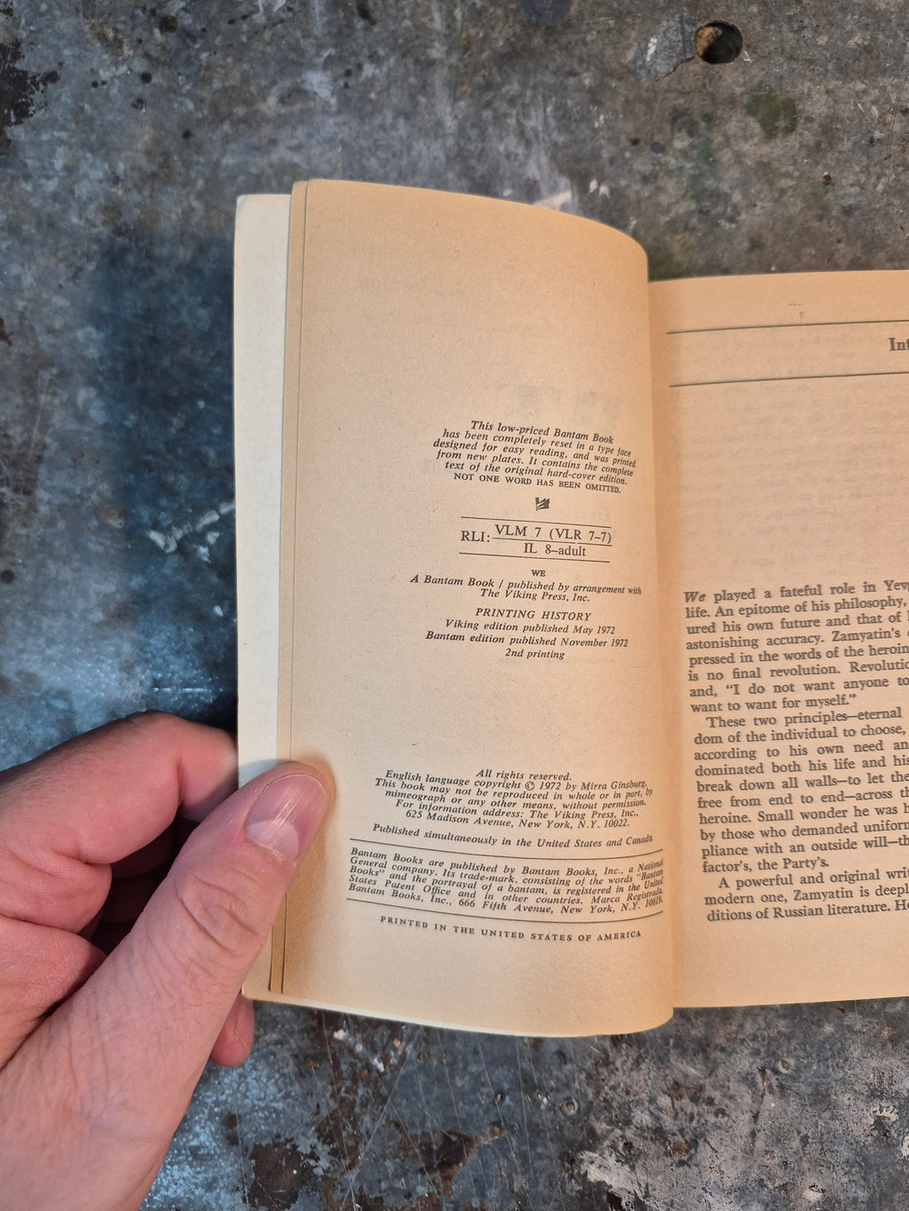 Early 70s edition of the classic novel by Yevgeny Zamyatin, in good condition with minor wear and tanning.
