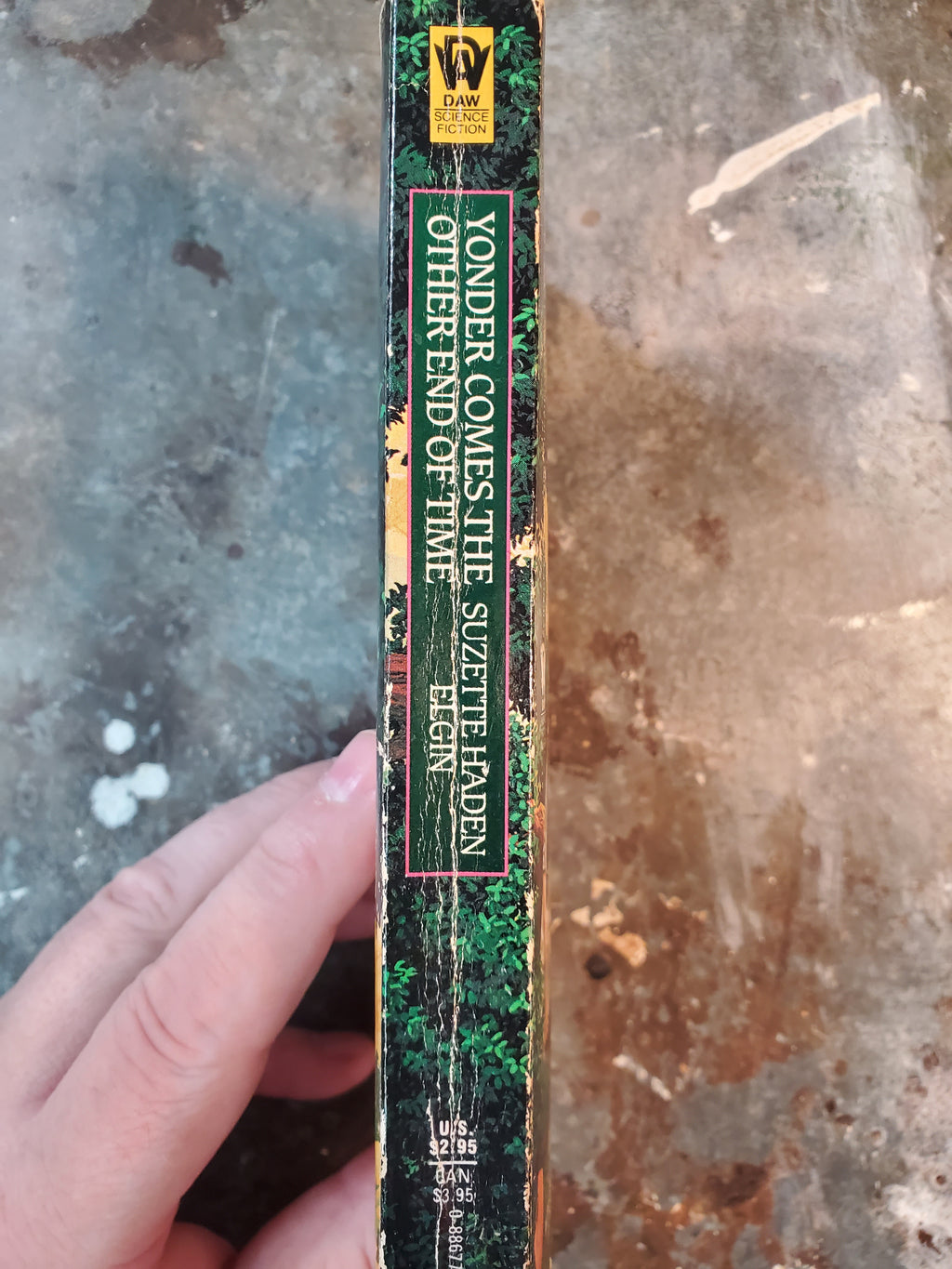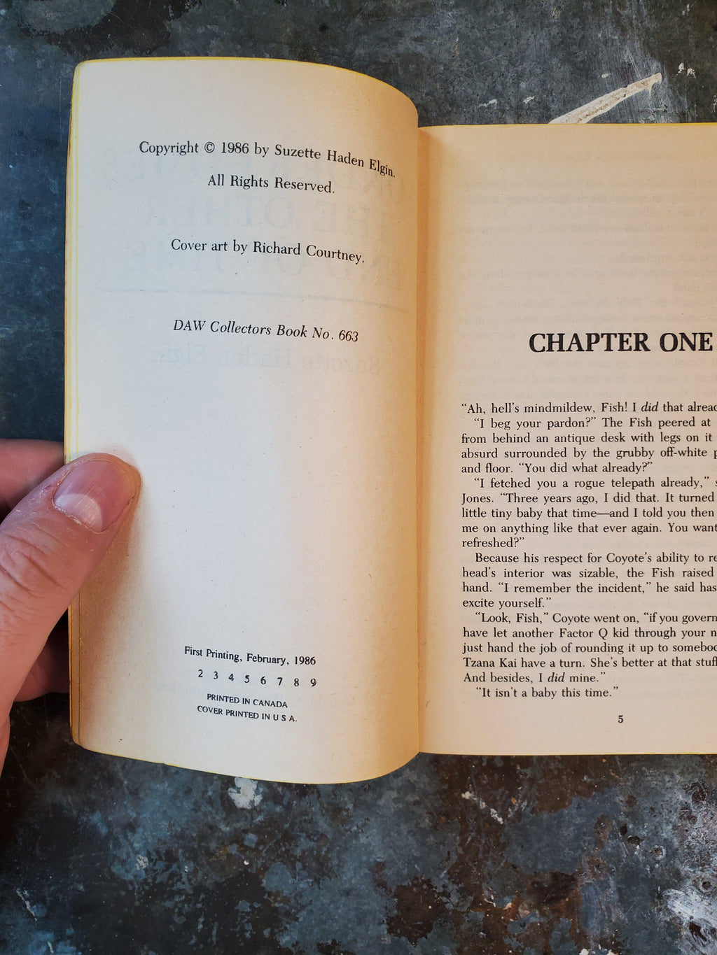 Mid 80s novel by Suzette Haden Elgin, in good condition with mild wear and tanning.